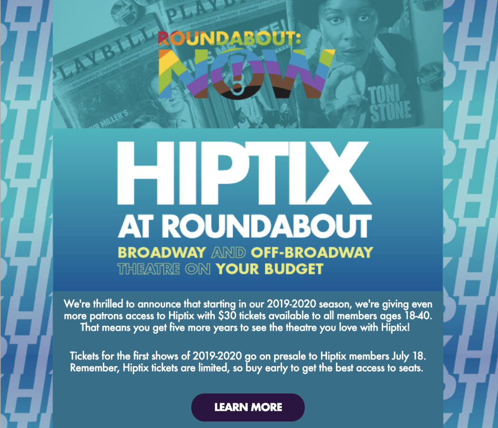 I oversaw the Hiptix program from 2017-2020, during a period of immense growth—nearly 20,000 new patrons enrolled. At the time, all members 35 and under could access $25 tickets to Roundabout shows.